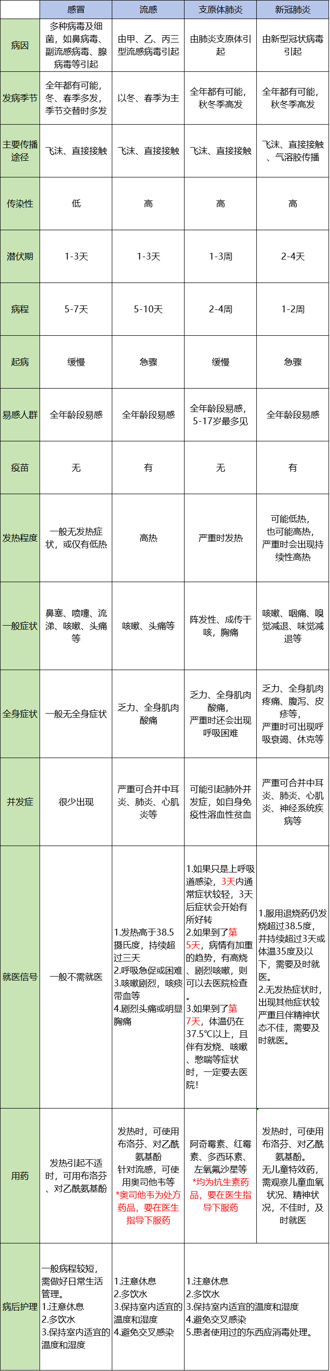 从病因、传播途径、治疗方法等方面进行对比,可以对病情做出初步判断。如果症状加重时,一定要及时去医院检查确诊并遵医嘱治疗、用药。此外,这些疾病可能存在混合感染,如流感混合支原体感染或者继发支原体感染,导致病情恶化或并发症增加。以上疾病高发的原因除了季节性流行之外,也和感染过新冠(COVID-19)病毒后造成免疫系统紊乱、容易诱发呼吸道疾病有关。