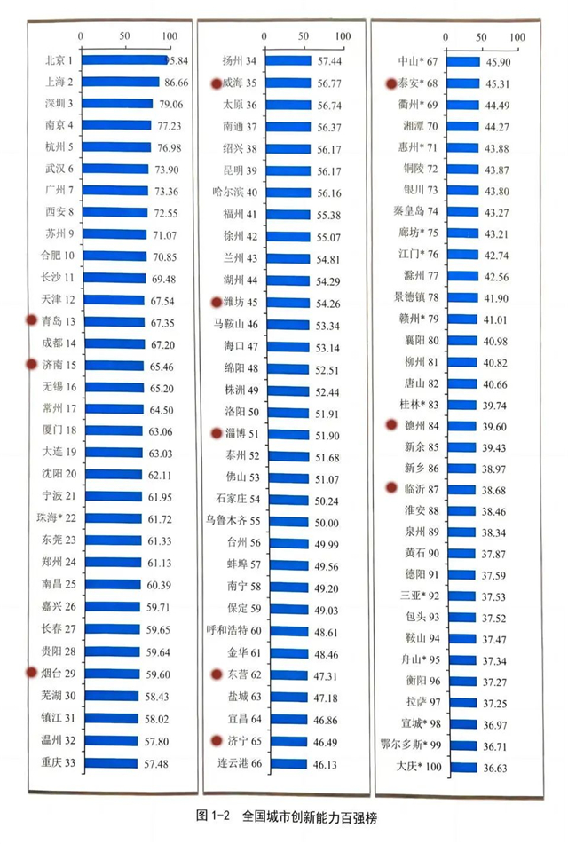 从全国城市创新能力百强来看,山东共有11座城市上榜,分别是:青岛、济南、烟台、威海、潍坊、淄博、东营、济宁、泰安、德州、临沂。其中,威海名列全国城市创新能力百强榜第35位。