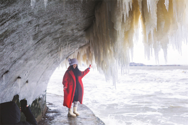 葡萄滩海水浴场栈桥护栏的冰凌景观,吸引游客和市民前来打卡。