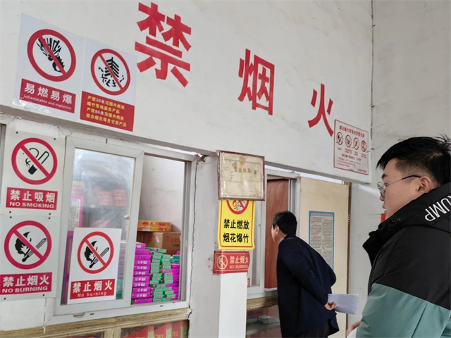 目前,大疃镇辖区内共有1个爆竹零售网点为益铭商行。该零售店周边无加油站及其他易燃易爆生产、储存设施,没有学校、医院、幼儿园等人员密集场所。益铭商行负责人已签订《烟花爆竹零售店(点)安全管理目标责任书》,同时在零售场所醒目位置设置“严禁烟火”“易燃易爆”“禁止燃放烟花爆竹”等安全警示标识,配备2具灭火器。经检查暂不存在安全隐患。