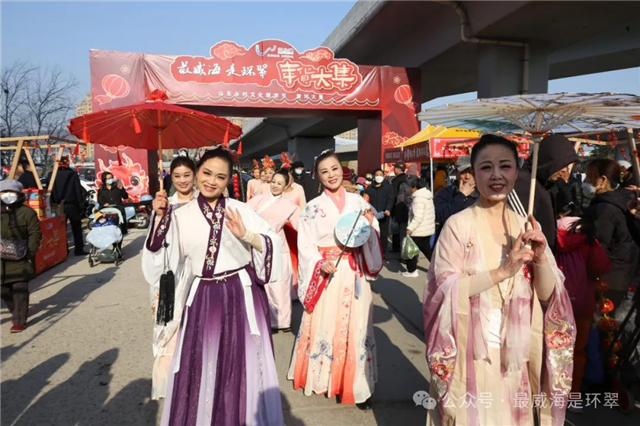 边走边逛,不仅能买到很多平时买不到的“尖货”,还能欣赏精彩的文艺演出。国风巡游、威海大鼓、萨克斯演奏、快闪舞蹈等接连不断,大家围在舞台前看得津津有味,更有不少人拿起手机记录下这热闹的场面。