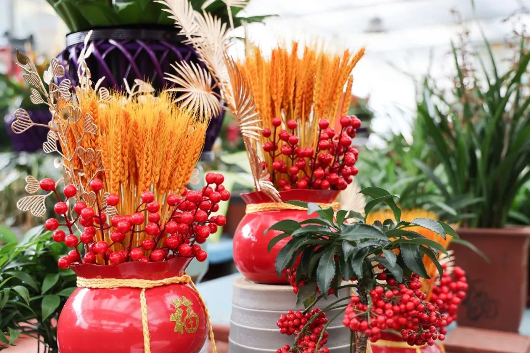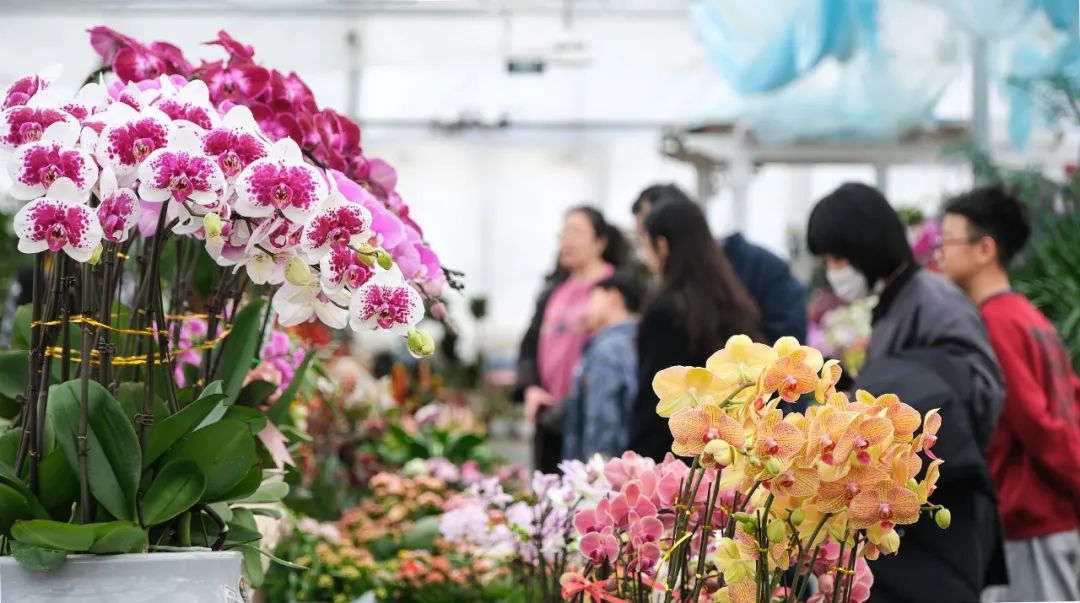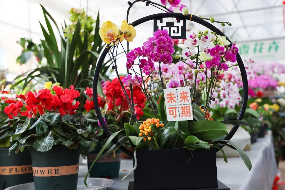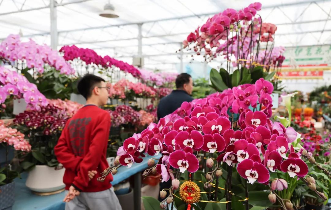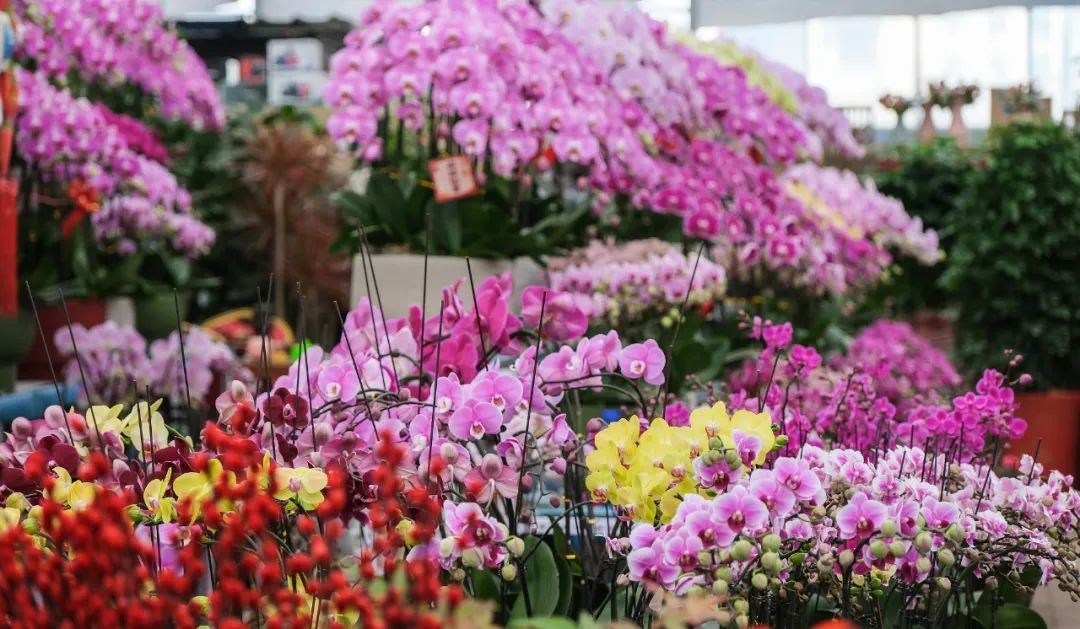蝴蝶兰品种丰富、花期超长,寓意着幸福和美好,并且花色靓丽,气质优雅端庄,深受消费者青睐。金桔象征着好运和财富,佛手则象征着福气和吉祥,都成为人们佳节走亲访友的绝佳礼物。除了这些吉祥花卉,发财树、红掌、朱顶红、杜鹃花等也是春节期间消费者们追捧的热门品种。不少店家将印有“未来可期”“见花则喜”“好事花生”等美好寓意的字牌挂于枝头,以花“祈愿”,营造浓浓年味儿。店主王女士表示,节日期间颜色鲜艳,寓意吉祥的花卉最受欢迎,今年的销售量比去年能增长30%左右。