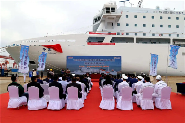 此次交付的客滚船W0280项目命名为“鉴真号”,船长167.2米,船宽25米,设计吃水6米,载重4550吨,航速21节,全船定员240人,其中船员48人、旅客192人。“鉴真号”投入运营后,主要往返于上海、大阪和神户。