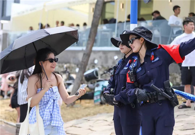 7月24日,盛夏的海水浴场,海风和鸣,生机盎然。行走在环海路上,处处别致的网红景观小品与大海、沙滩相映成趣。海天一色间,一群藏蓝的身影悄然入画,整齐划一的脚步由远及近,英姿飒爽的女警,在这个红火的七月,带来了蓬勃朝气。她们既是疏堵保畅的引导员,也是服务群众的守护者,同时兼职导游,介绍景点路线、概况等。