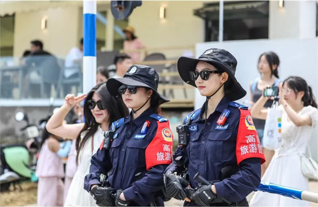 “为确保景区秩序持续平稳,提升游客的安全感和满意度,我们建立健全‘流动+定点’用警机制,设置低空警务专班、女警巡逻队、电动车警务巡逻队、街道步行巡逻组四个小组不间断巡逻,全方位提升巡逻密度和频次,首次加入女警巡查,也是想充分利用女警独有的‘柔性温度’,给游客带来更加细致贴心的服务。”高区公安分局特巡警大队中队长谢蕾章说。