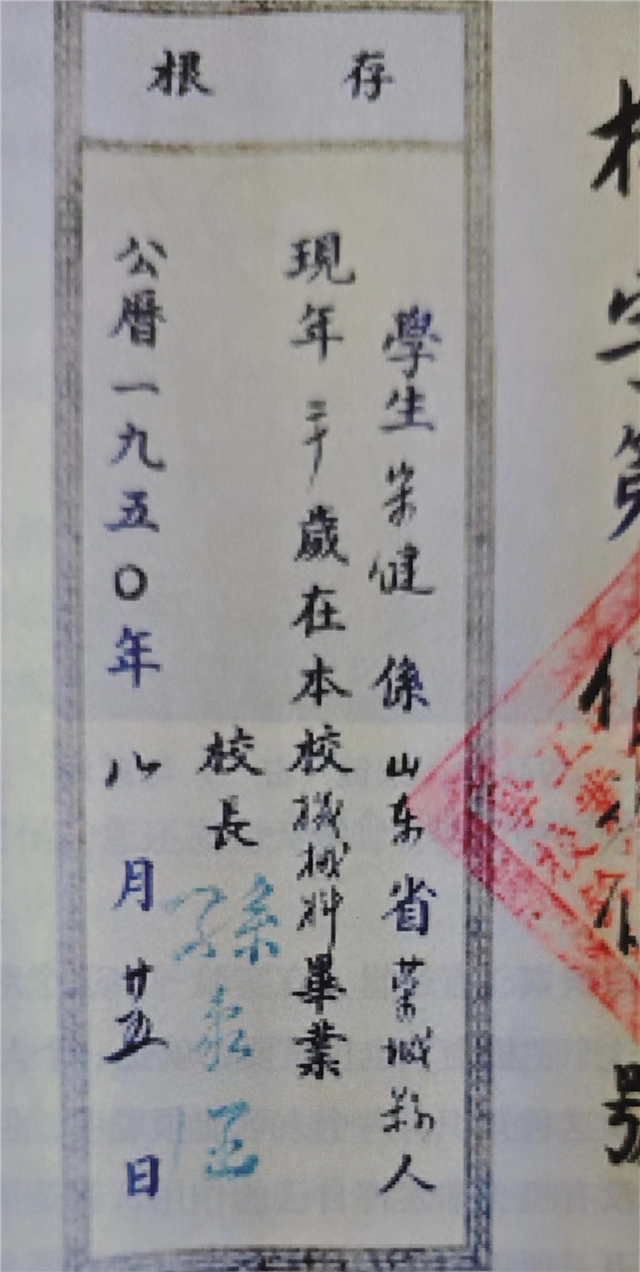 宋健院士早年的毕业证存根(荣城应为荣成)