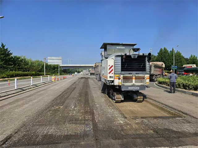 施工现场近日正在进行铣刨作业,铣刨机对半侧路面进行铣刨,将路面上的沥青刨起、打碎,再通过传送带输送到装载车辆中,统一清运。在施工过程中,采取半幅封闭施工方式推进,按照相关规定设置各类安全警示标志,引导过往车辆按指示标志慢行,有序通过施工路段,确保安全施工。