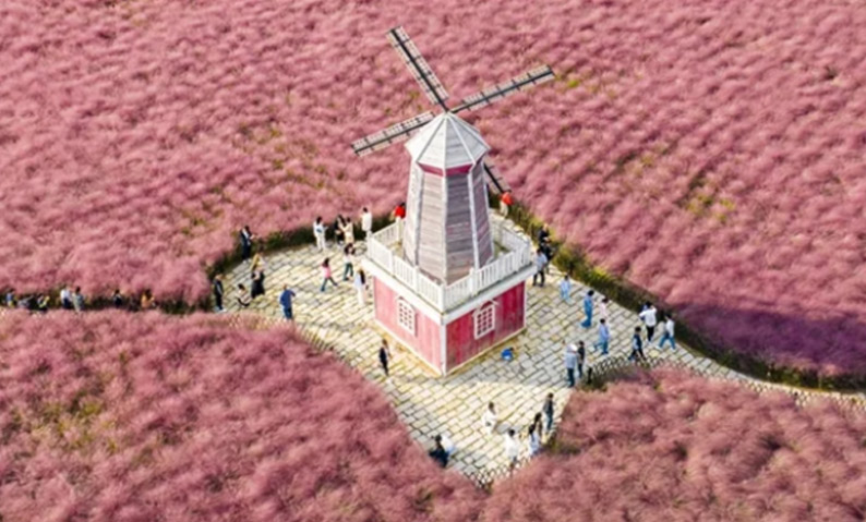 眼下正是观赏粉黛乱子草的最佳时节,羊亭河湿地公园内,一大片粉黛乱子草随风轻轻摇曳,犹如粉色海洋,美不胜收,吸引了不少市民前来拍照留念。在花海间点缀着的风车小屋更为这抹粉色增添了几分浪漫气息。“根本停不下来,就这一会的功夫手机里已经有20多张照片了。”邹文露和赵亚飞在网络上看到关于这片粉色花海的信息后,便迫不及待地前来打卡,发现现实中的景色比网图还要美丽,为他们的假期增添了浪漫氛围。