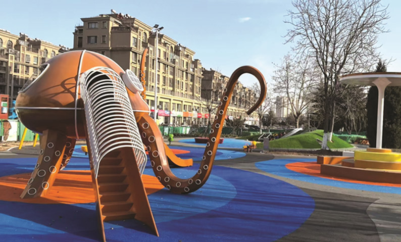 蔚海游园面积约4500平方米,以“遨游海洋”为主题,提取海洋相关元素及IP,打造成集儿童游玩、运动健身、休闲娱乐、自然科普的全龄友好游园。游园分为儿童游乐东区和休闲活动西区两个区域。