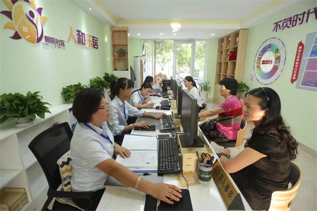 环翠区鲸园街道朝阳社区群众在办事大厅办理业务