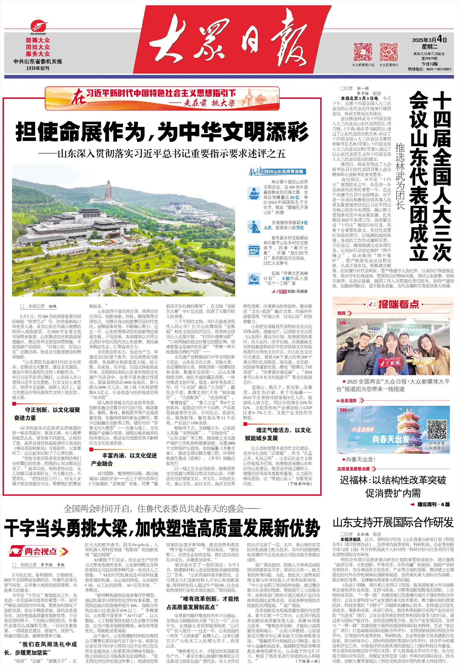 3月1日,约500名欧洲游客乘坐国际邮轮“欧罗巴2”号,经青岛邮轮口岸免签入境,成为山东近年最大规模的欧洲入境旅游团,为2025年全省文旅市场带来春意。山东推动文化和旅游深度融合,推出各种文旅促消费措施,丰富旅游产品供给。“好客山东 好品山东”出圈出彩,恰是文化强省建设的精彩缩影。