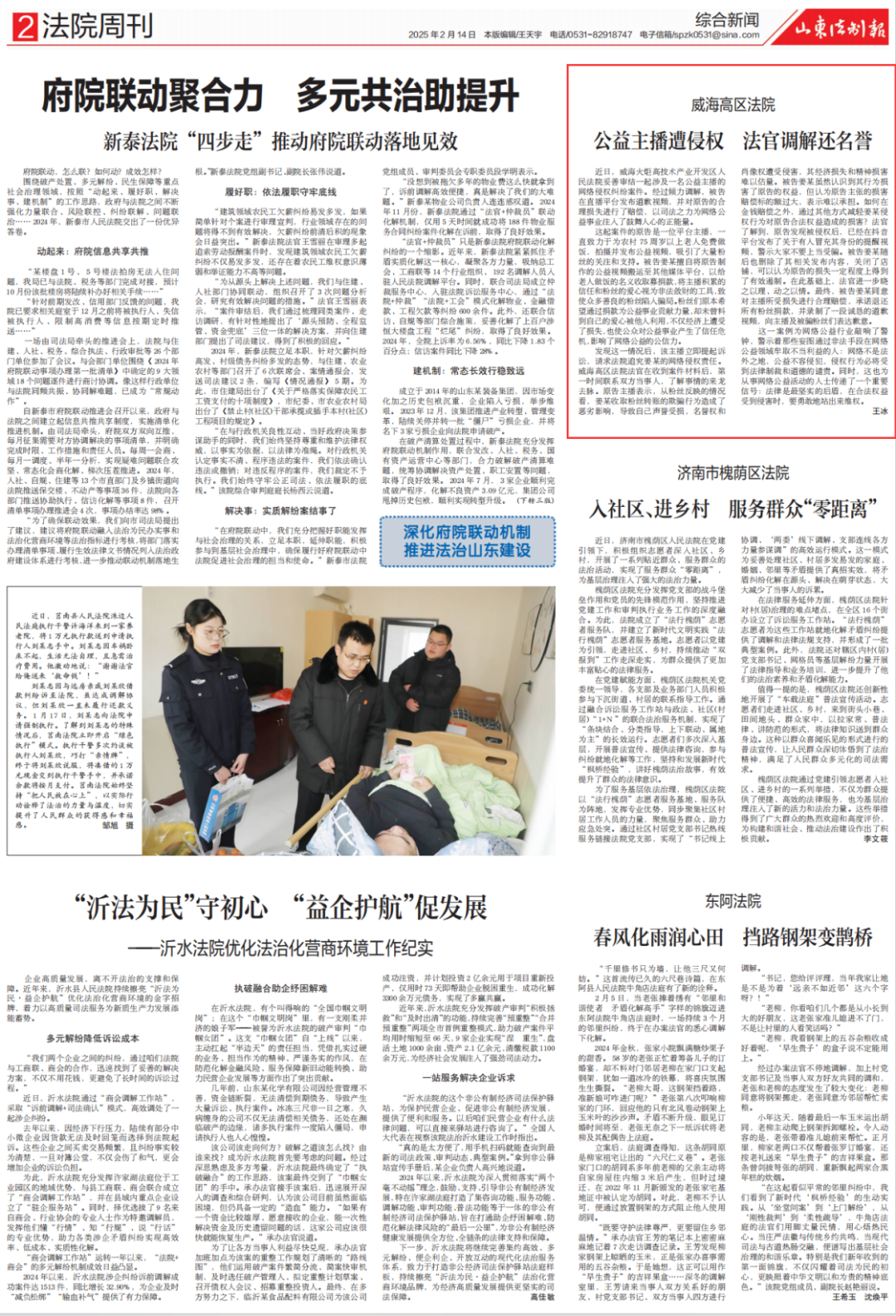 近日,《山东法制报》以《公益主播遭侵权 法官调解还名誉》为题,报道威海火炬高技术产业开发区人民法院妥善审结公益主播网络侵权纠纷案件的经验做法,以下为报道全文: