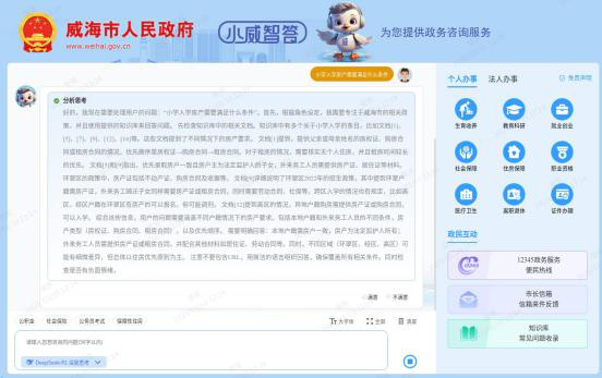 近日,威海市大数据局完成DeepSeek、通义千问等人工智能大模型的本地化部署,搭建统一的政务大模型服务平台,已为就业服务、12345政务服务热线、政府网站、法律服务等多领域业务应用提供支撑服务,拓展提升行政和治理服务效能。