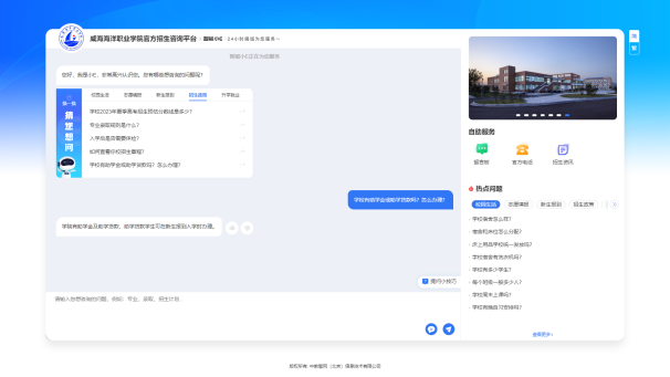 威海海洋职业学院智能招生问答系统依托DeepSeek大模型的强大语义理解能力,迅速识别考生咨询意图,精准回复录取分数、专业介绍和校园文化等丰富内容。