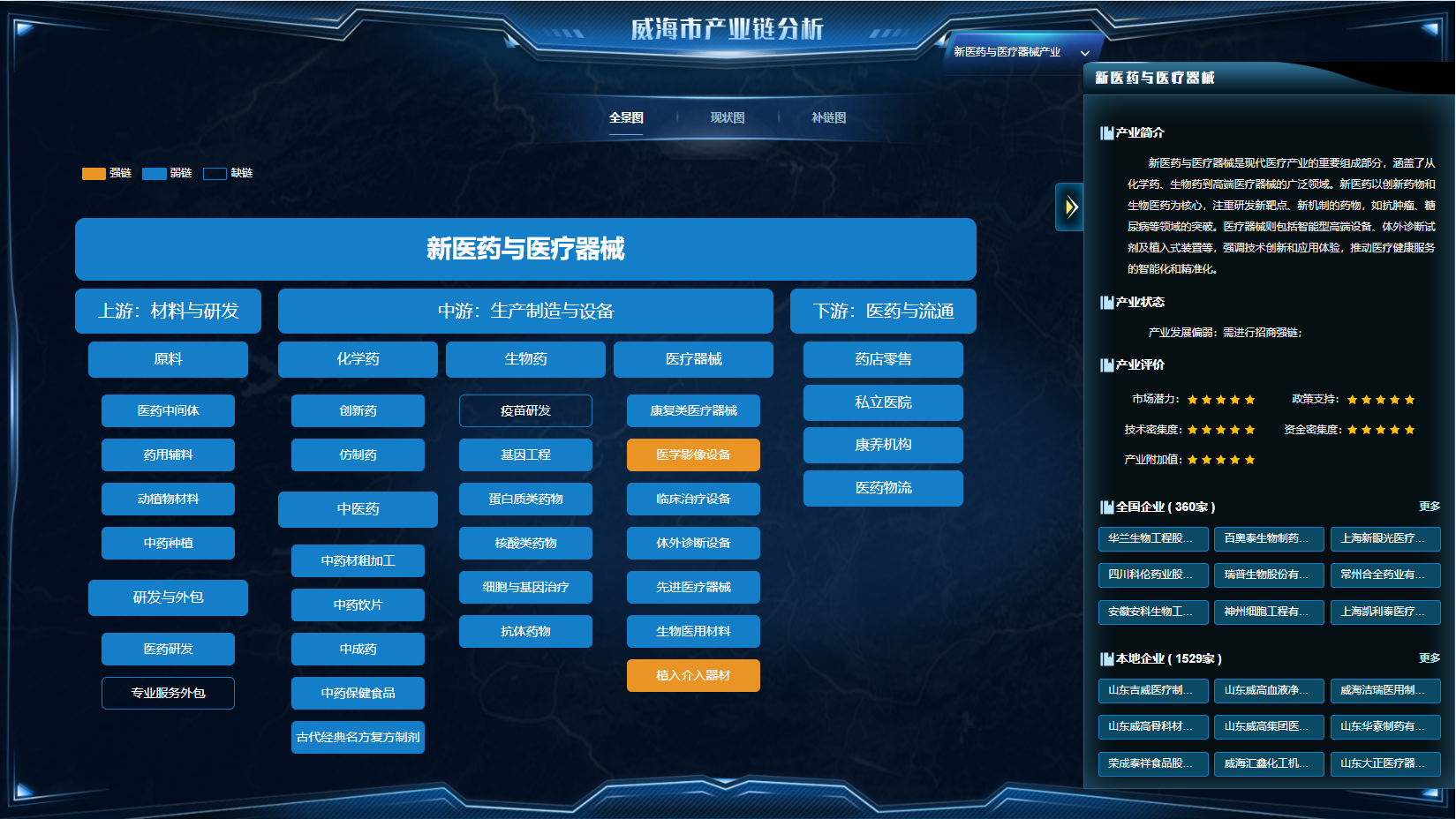 依据各产业链特征,使用大模型分析产业上下游、供需关系、空间关系,绘出上中下游产业链结构图,直观展现产业链结构和企业分布,辅助定位强、弱、缺链,提升招商效率。