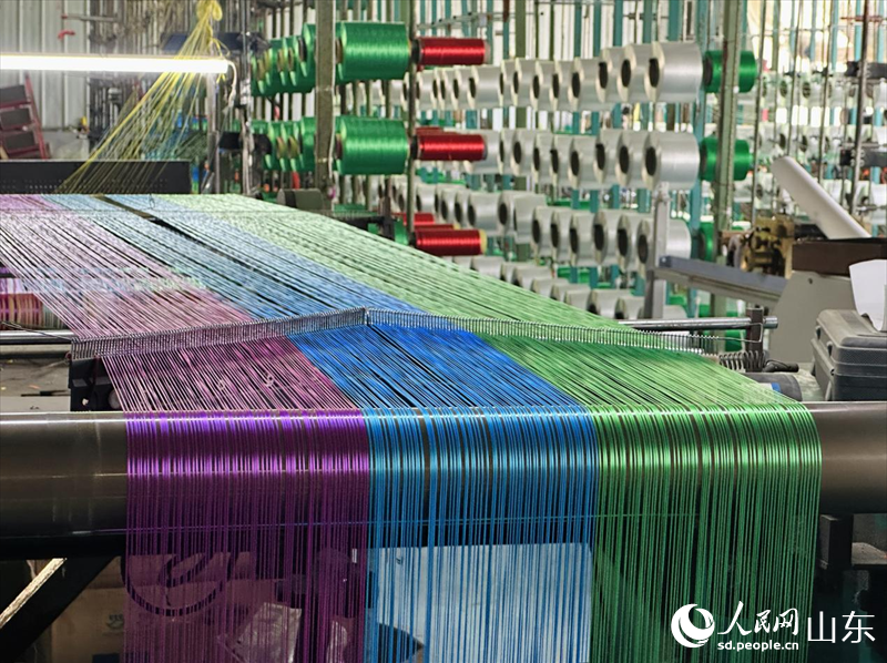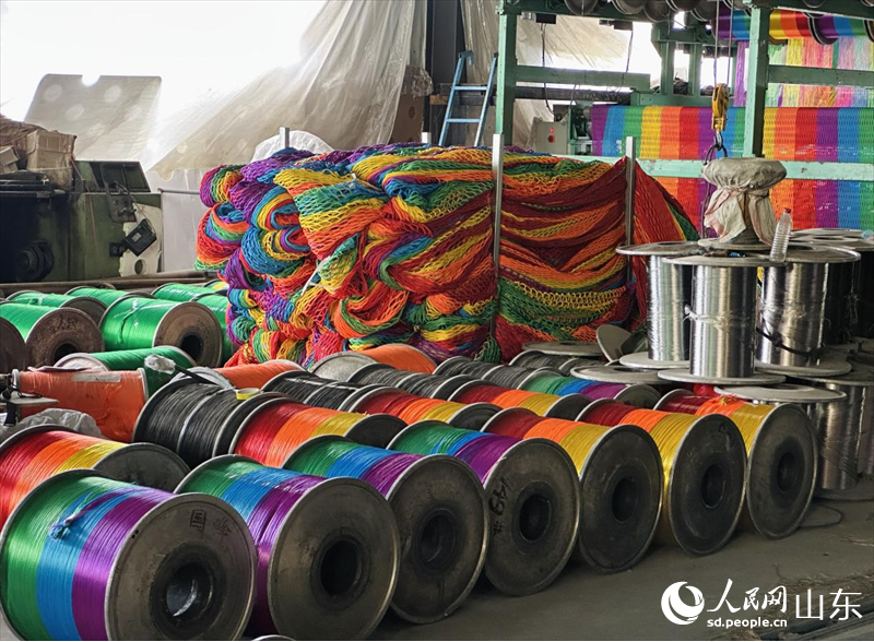 山东滨州惠民县李庄镇一家绳网企业,织机上五颜六色的绳线。人民网 乔姝摄