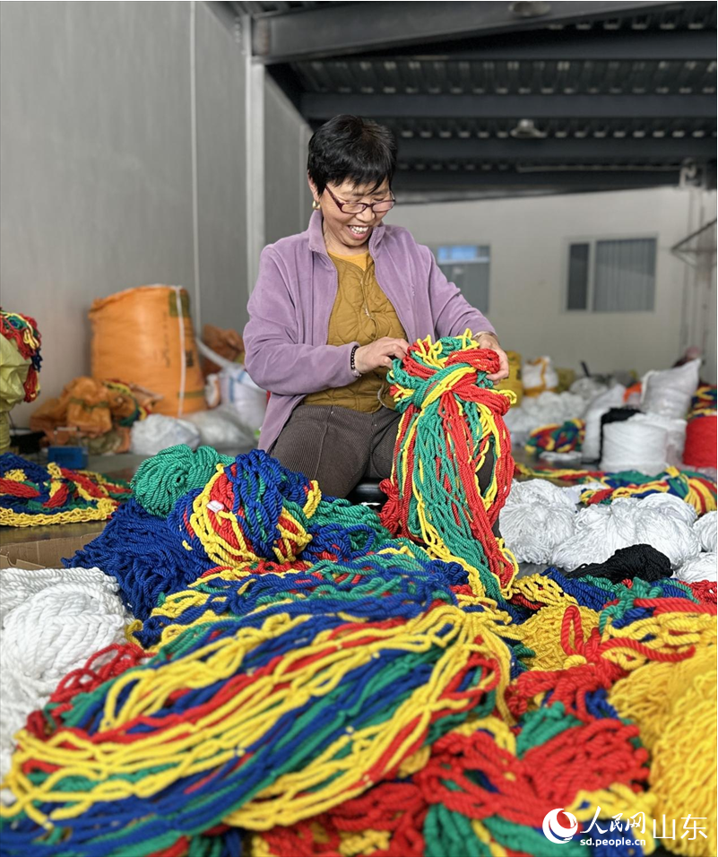 4月13日,在山东滨州惠民县李庄镇一家绳网企业,工作人员正在加工绳网产品。人民网 乔姝摄