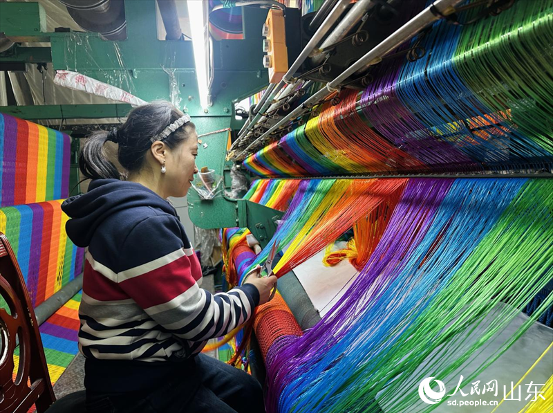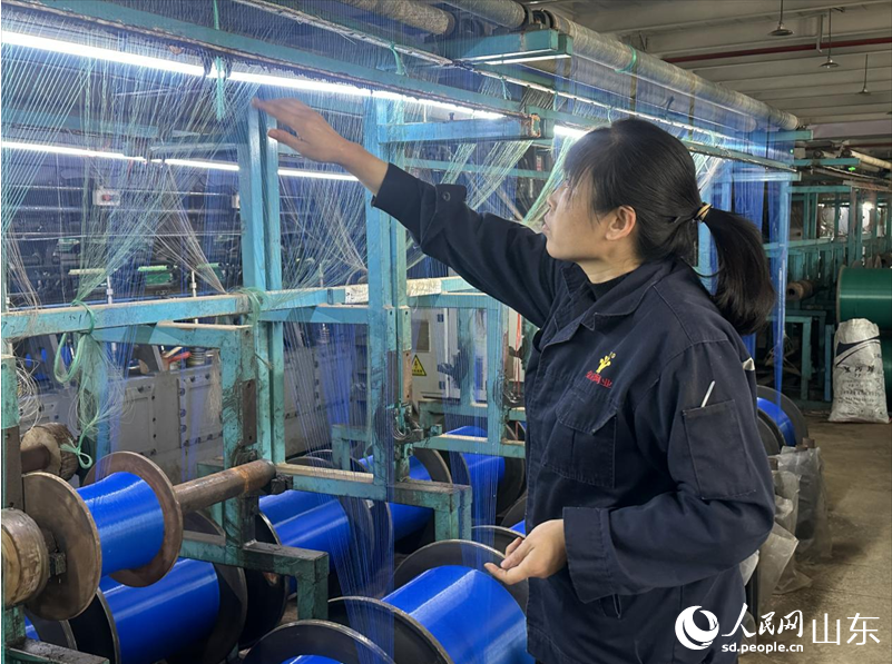 4月13日,在山东滨州惠民县李庄镇一家绳网企业,工作人员正在织机前忙碌。人民网 乔姝摄