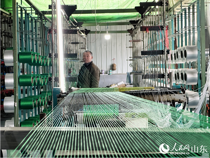 4月13日,在山东滨州惠民县李庄镇一家绳网企业,工作人员正在织机前加工绳网产品。人民网 乔姝摄