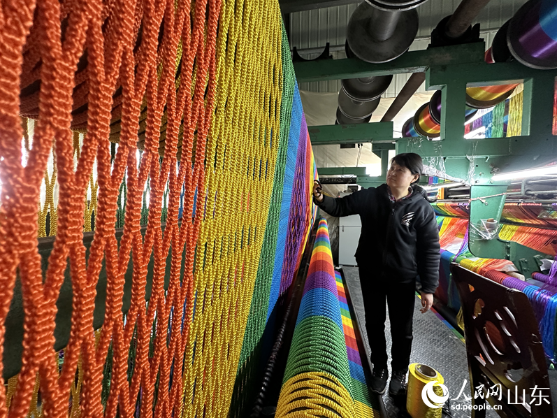 4月13日,在山东滨州惠民县李庄镇一家绳网企业,工作人员正在进行质检。人民网 乔姝摄
