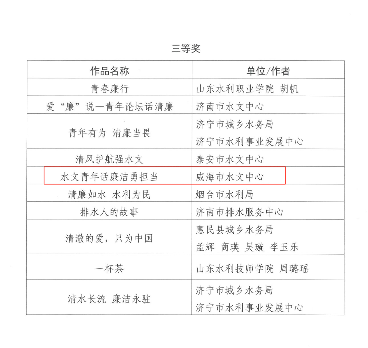 近日,山东省水利厅公布首届“齐鲁水清”杯廉洁文化作品创作大赛获奖情况,威海市水文中心快板作品“水文青年话廉洁勇担当”荣获三等奖。