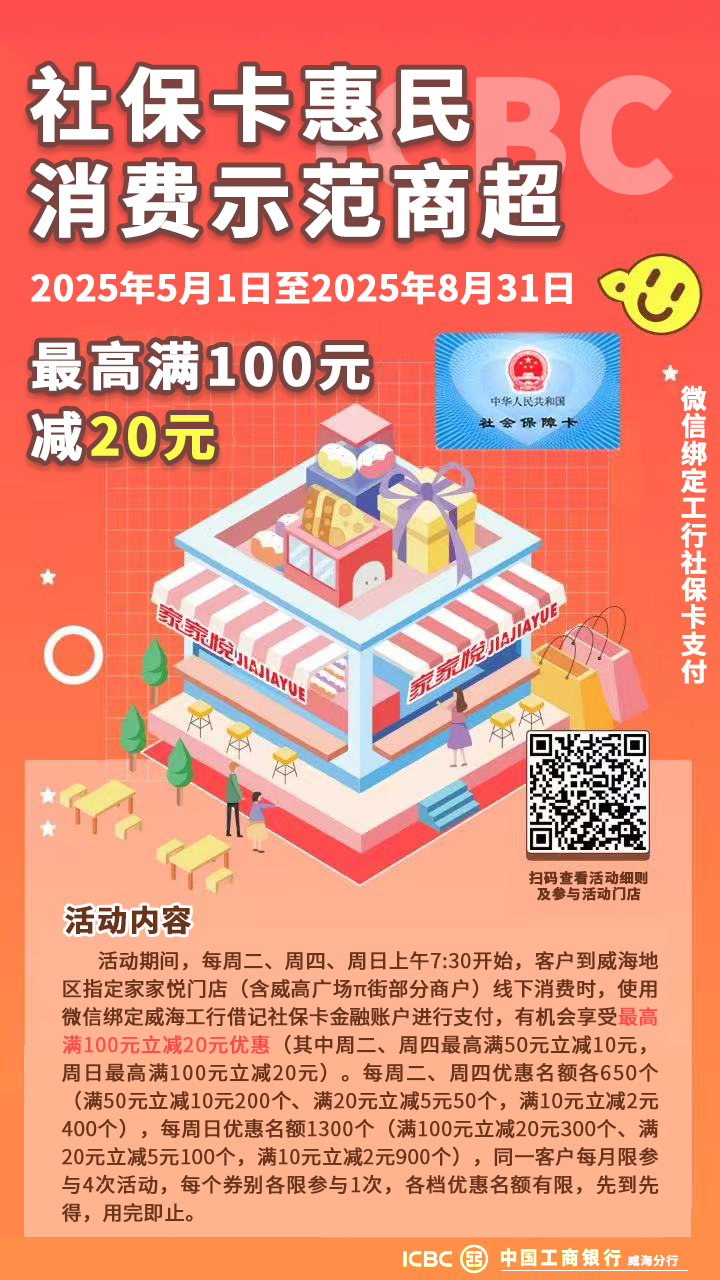 最高满100元减20元!威海工行社保卡家家悦满减活动邀您参与