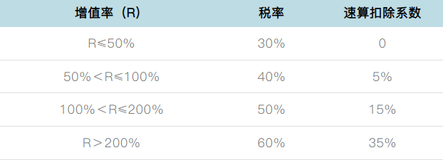 答:土地增值税采用超率累进税率,税率根据转让房地产的增值率(增值额占扣除项目的比例)分为四级,具体税率及对应速算扣除系数如下: