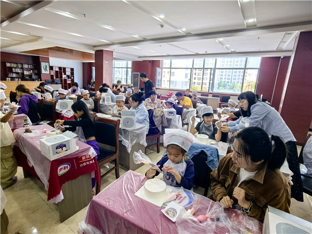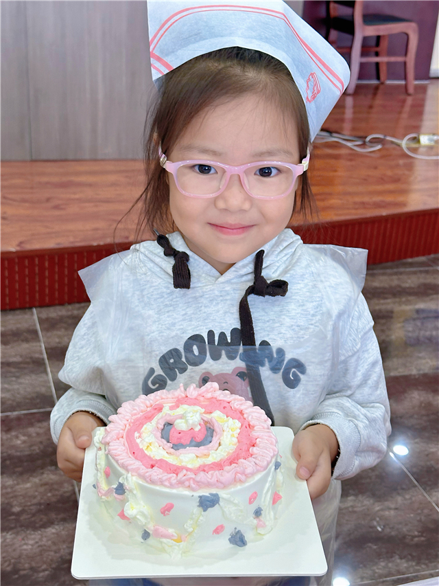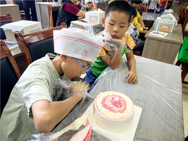 烘焙体验正式开始,志愿者为每个家庭分发了围裙、手套和制作材料。系着迷你围裙的孩子们手握裱花袋,小脸上写满了专注。有的孩子小心翼翼地挤压裱花袋,看着奶油从裱花嘴中缓缓流出,在蛋糕表面勾勒出波浪般的纹路;有的孩子尝试着画圆圈,创作出一个个可爱的云朵造型。不时能听到惊喜的欢呼:“看我画出了一朵会跳舞的花!”“我要给蛋糕穿上蕾丝裙子!”年纪较小的孩子直接用手蘸着奶油,在蛋糕上点出一个个可爱的小圆点,开心地展示着自己的“星空蛋糕”。