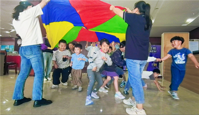 活动开始,志愿者们先带领着孩子们蹦蹦跳跳,尽情释放天真活力。家长们则合力撑起巨大的彩虹伞,随着伞面如波浪般上下翻腾,伞下瞬间化作一片绚烂神秘的“海洋”。小朋友们兴奋地躲进这片色彩斑斓的“大海”中,化身成为可爱的小鱼、小海龟和各种海洋生物。当工作人员用诙谐的语气喊出“大鲨鱼来啦!”的瞬间,现场气氛瞬间达到高潮——孩子们欢笑着、惊叫着从伞下四散“逃生”,清脆的笑声与家长们的欢呼声交织在一起,构成了一幅生动又温暖的亲子互动画面。