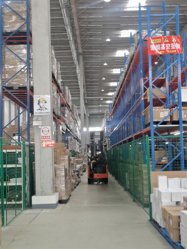 10月3日上午,在威海泓信供应链菜鸟仓内,七万平方米的仓储空间中货架整齐林立,工作人员正忙碌地进行库存盘点与整理,为即将到来的物流高峰做足准备。