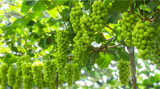 一踏入园区,仿佛瞬间切换了频道,闯入了一个由藤蔓与果实编织的绿色世界。阳光透过层层叠叠的叶片,洒下斑驳摇曳的光影,空气中弥漫着浓郁而醉人的果香,混合着泥土的芬芳。目光所及,一排排整齐的藤架上挂满了累累硕果,如同珍宝般等待人们的发现。阳光玫瑰青翠欲滴,颗颗饱满圆润,仿佛黄绿色的宝玉,入口是经典的玫瑰清香与高浓度的甜,却甜而不腻,果肉紧实脆爽。园区负责人介绍,目前园区内拥有甬优、阳光玫瑰、A17、夏黑4个品种,采摘时间持续到10月底。