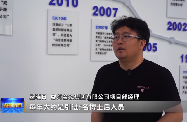 威海金泓集团有限公司项目部经理丛晓日说,集团现在总共是有两个国家级平台,国家企业技术中心和博士后科研工作站,10个省级平台,每年大约是引进5名博士后人员,和企业联合研发,总计每年应该有20多项新产品。