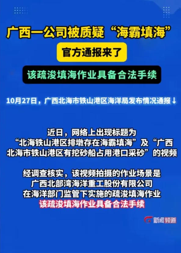 近日,网络上出现标题为“北海铁山港区排墩存在海霸填海”及“广西北海市铁山港区有挖砂船占用港口采砂”的视频,引发网民关注。