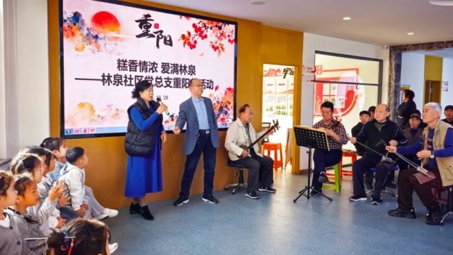 古韵林泉,孝暖重阳。在林泉社区文化书院,京胡声起,锣鼓点落,老人们的目光都紧紧追随着京剧表演的推进。京剧票友董立明和吕里演唱的《三娘教子》率先登场,将三娘含辛茹苦的育儿历程与舐犊情深展现得淋漓尽致;98岁的戚和同老先生一曲铿锵有力的保家卫国主题戏曲,引得台下观众连连叫好;最后,林治钦一首独唱《母亲》用饱满的情感、动人的歌声,唱出对母亲的眷恋与敬爱,展现了银龄一代的活力与风采,赢得了全场热烈的掌声。
