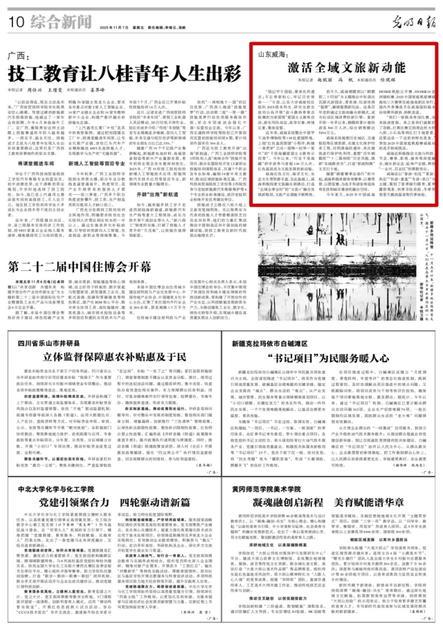 11月7日,《光明日报》推出《山东威海:激活全域文旅新动能》稿件,通过刘公岛红色研学火爆、栖霞街文旅商融合模式走俏、“跟着赛事去旅行”业态兴起等代表性案例,深入报道威海打造全域全季全时“文旅+”融合发展新格局、释放旅游“一业兴、百业旺”乘数效应的生动实践。以下为报道全文。