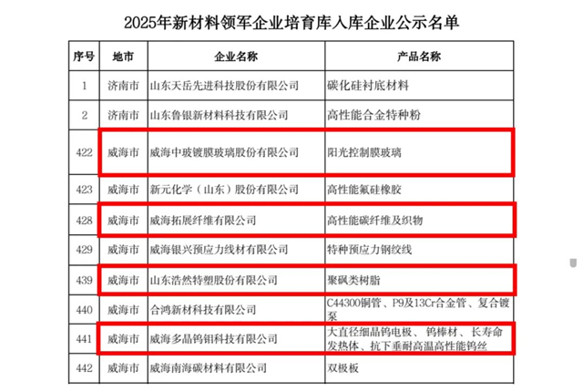 近日,山东省新材料领军企业培育库入库企业名单公布,临港区的威海中玻镀膜玻璃股份有限公司新入选,威海拓展纤维有限公司、山东浩然特塑股份有限公司、威海多晶钨钼科技有限公司通过复核,展现了临港区在新材料领域的强劲实力与持续创新能力。