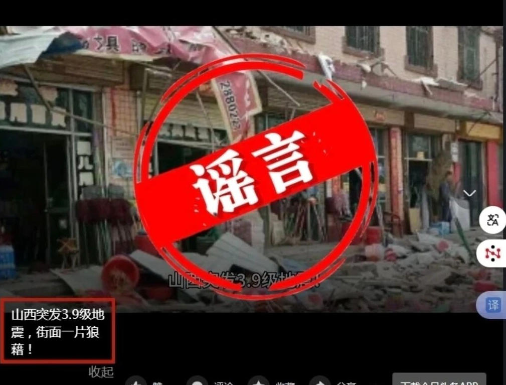 近期,山西忻州网警在工作中发现,一网民在自媒体平台发布一段标题为“山西忻州3.9级地震,街面一片狼藉”的虚假视频,引发舆论关注,造成当地居民恐慌。视频发布后,山西省地震局通过公众号发布标题为《辟谣公告:“山西突发3.9级地震,街面一片狼藉!”与事实不符》的辟谣文章。