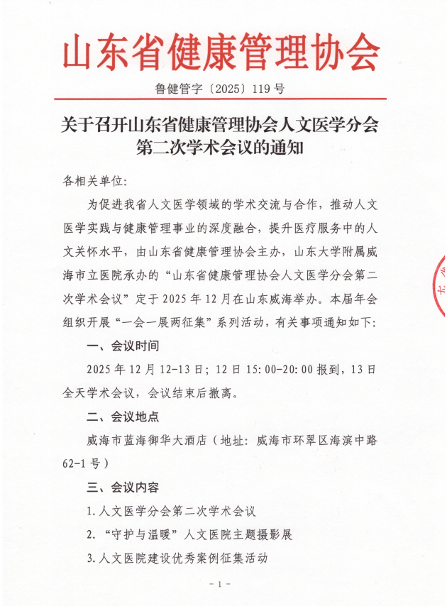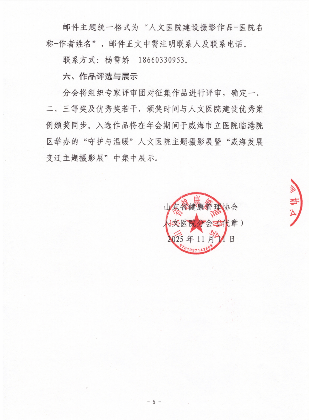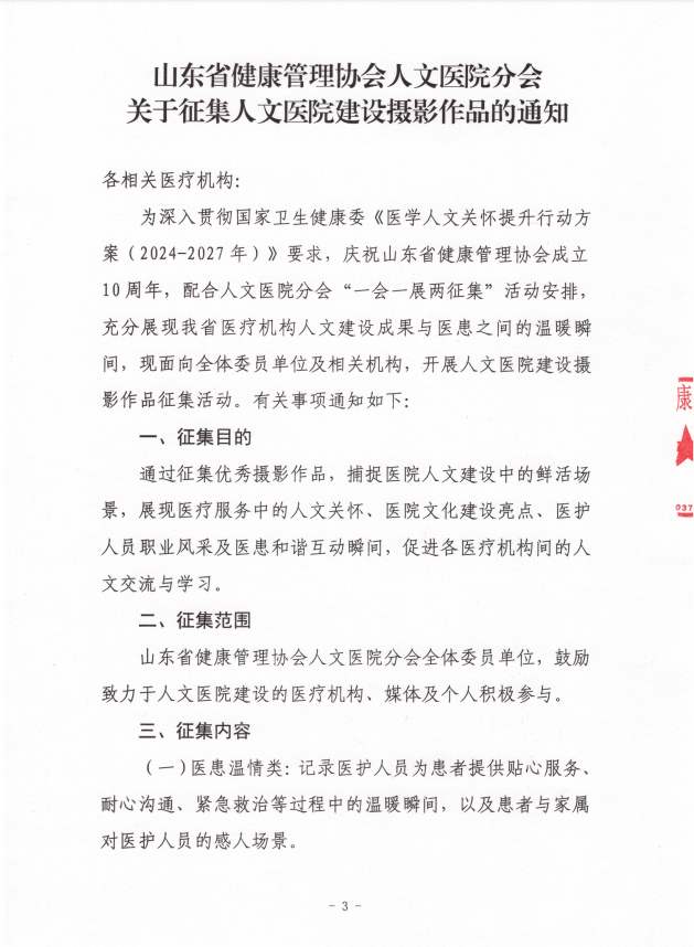 为深入贯彻国家卫生健康委《医学人文关怀提升行动方案(2024-2027年)》要求,庆祝山东省健康管理协会成立10周年,配合人文医院分会“一会一展两征集”活动安排,充分展现我省医疗机构人文建设成果与医患之间的温暖瞬间,现面向全体委员单位及相关机构,开展人文医院建设摄影作品征集活动,诚邀您用镜头捕捉感动、记录美好。