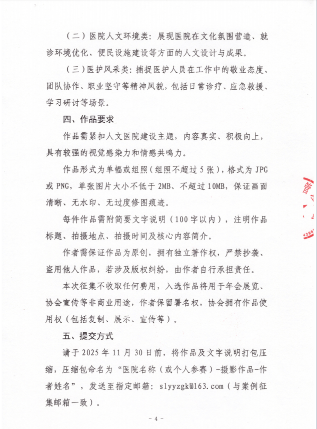 3.邮件投递:发送至指定邮箱slyyzgk@163.com(与案例征集邮箱一致),邮件主题统一格式为“人文医院建设摄影作品-医院名称-作者姓名”,邮件正文中需注明联系人及联系电话。