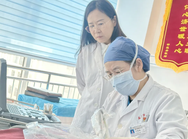 在麻醉治疗室,于栋娟带领团队现场演示了“超声引导下颈交感神经节阻滞技术”。其娴熟的操作手法、精准的神经定位与高效的治疗流程,赢得了李静等同行的高度认可。李静表示,该技术在提升患者舒适度方面表现突出,“操作几乎无痛感,单例治疗仅需一至两分钟,体现出极高的专业水准。”