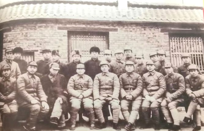 1939年冬,山东纵队政委黎玉率巡视团赴胶东抗日根据地视察,图为到达后与胶东区党委及五支队负责人合影(中排右四为华楠)。
