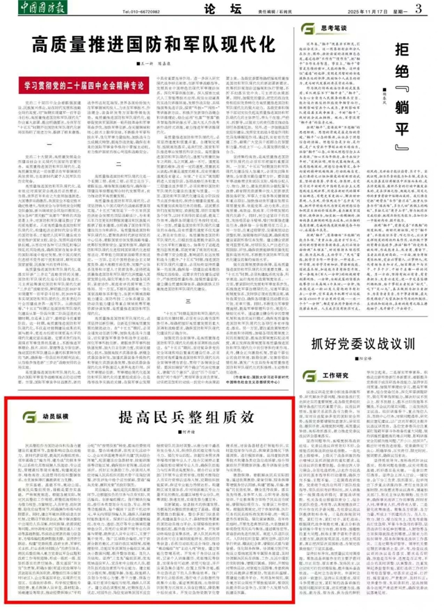 民兵整组作为国防动员和后备力量建设的重要环节,直接影响应急应战能力。新时代新征程,提高民兵整组质效,须牢固确立“编为用、建为战”的根本导向,以系统化思维破解人员流动、专业适配、管理滞后等现实难题,构建规范有序、精准高效、实战管用的组织整顿体系,为支援保障打赢提供有力支撑。
