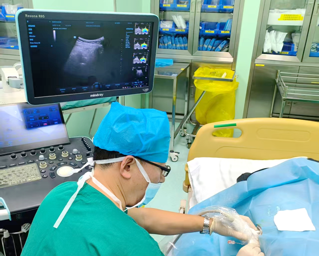 为破解这一临床难题,神经内科携手超声科主任医师张启波,组建专项治疗团队。术中,张启波借助超声实时显像,精准确定穿刺点,清晰呈现穿刺路径、角度与深度,一次性成功完成腰椎穿刺。随后,神经内科医师顺利实施鞘内药物注射。整个治疗流程安全、高效,显著降低了术后并发症风险,切实减轻了患者的治疗痛苦。