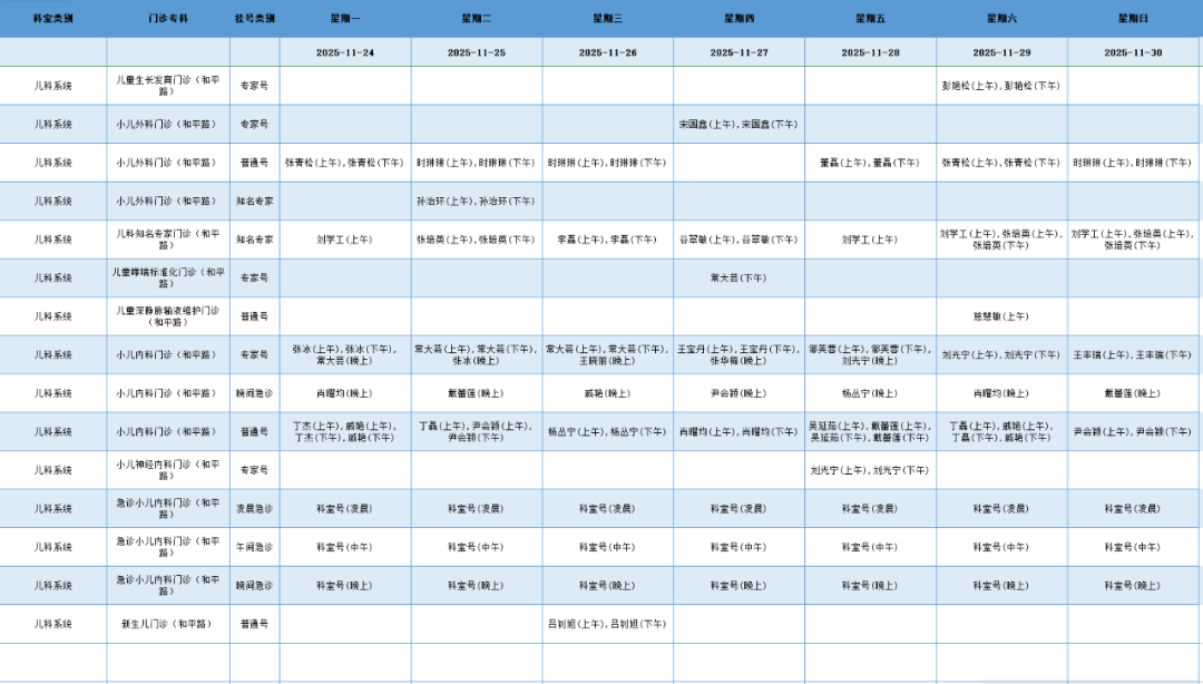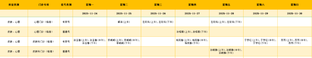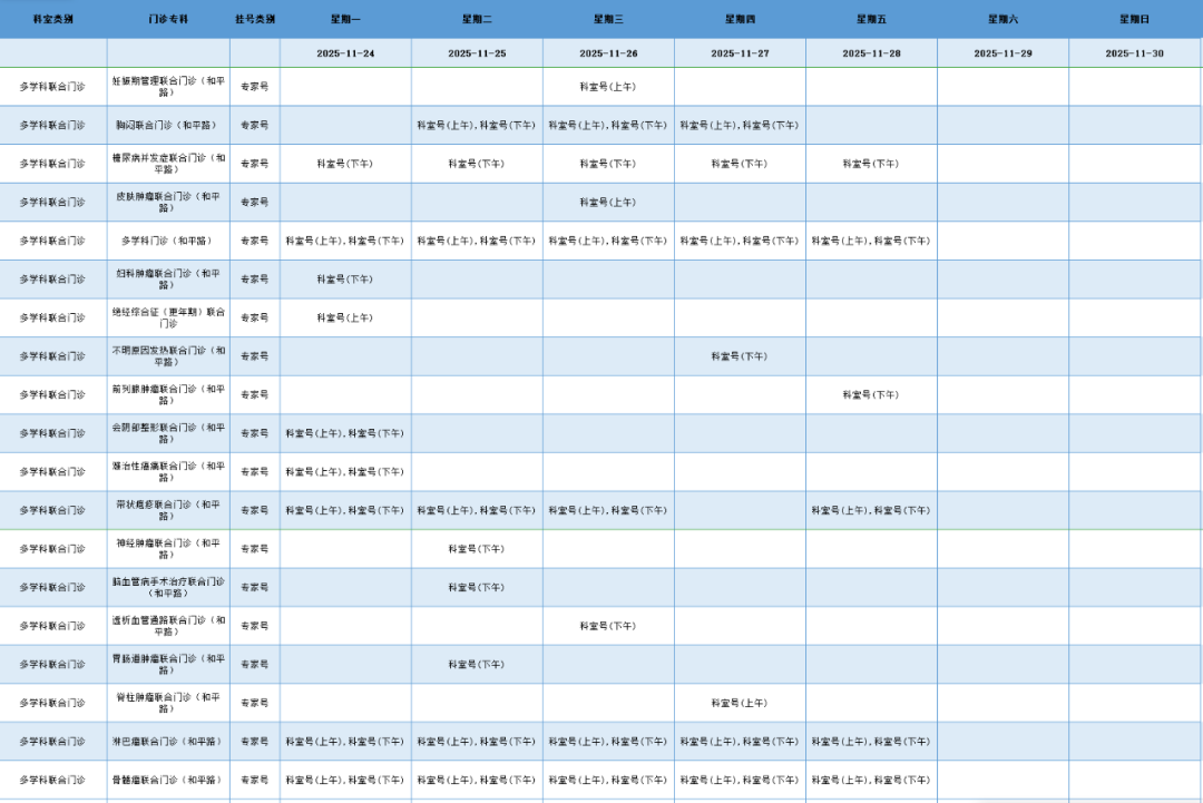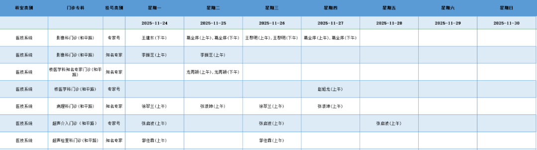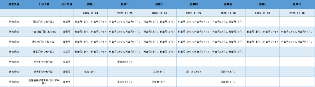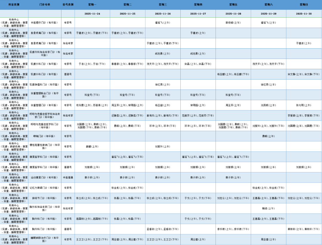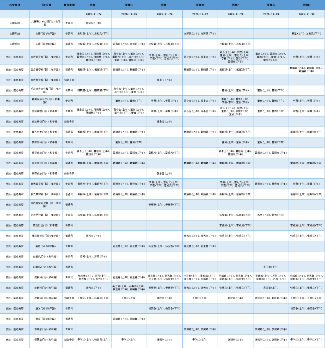 和平路院区心理、皮肤、医疗美容系统门诊排班表