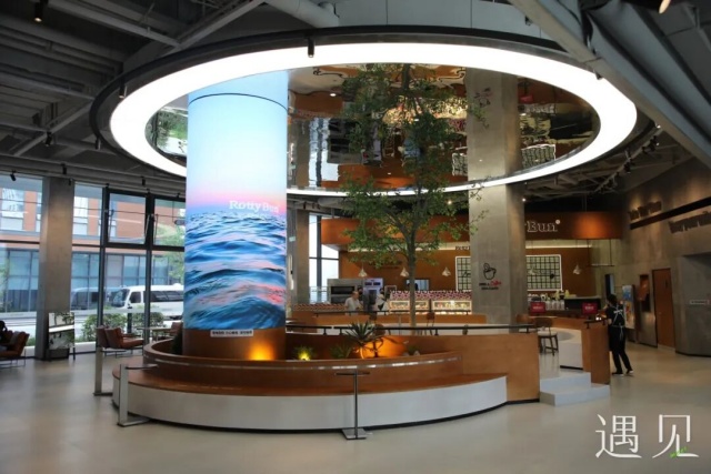 漫步街区,走进劳顶笨咖啡店,首先被中央那座环形光影装置牢牢抓住视线——巨大的圆柱屏滚动着威海海域的海浪与天际渐变,顶部环形灯带与镜面天花交织出梦幻感,仿佛把威海的山海风光搬进了室内,让步履匆匆的人,都能在这里找到与城市的共鸣。