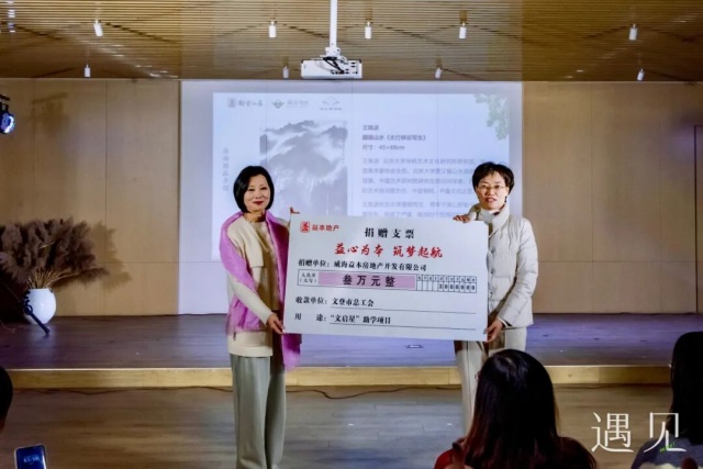 在今年1月举行的2025新年诗歌唱诵暨观云山居城市书房慈善拍卖会上,观云山居城市书房捐赠的八幅书法作品全部成功拍出,共筹得善款49700元,并现场追加捐赠3万元善款。全部善款用于文登区总工会的“益心为本 筑梦启航‘文启星’助学项目”,帮助贫困职工子女完成学业。