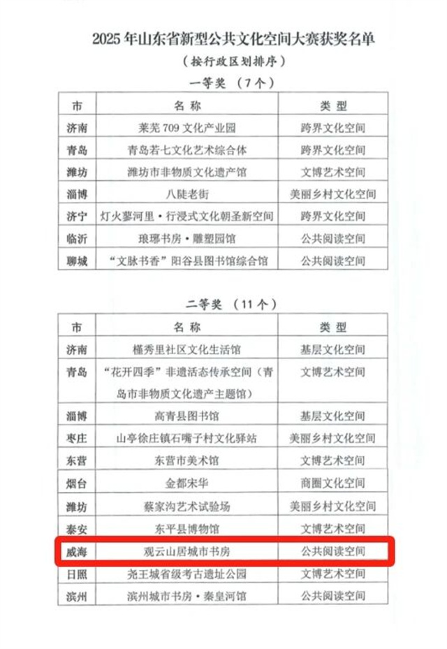 近日,山东省文化和旅游厅公布了2025年山东省新型公共文化空间大赛获奖名单,文登区观云山居城市书房荣获二等奖。