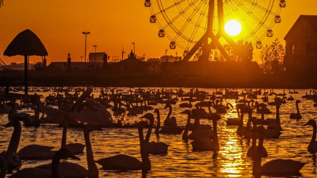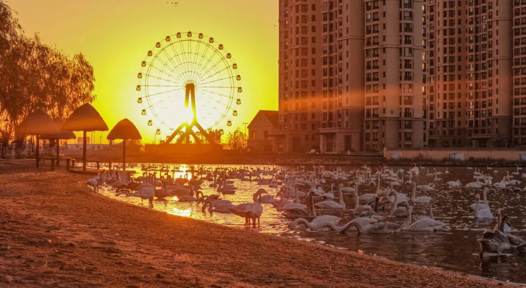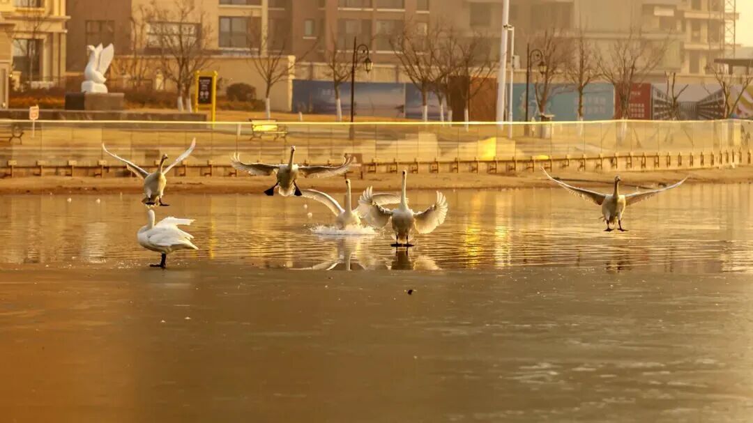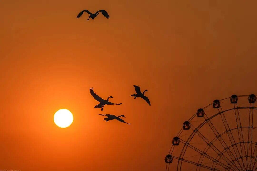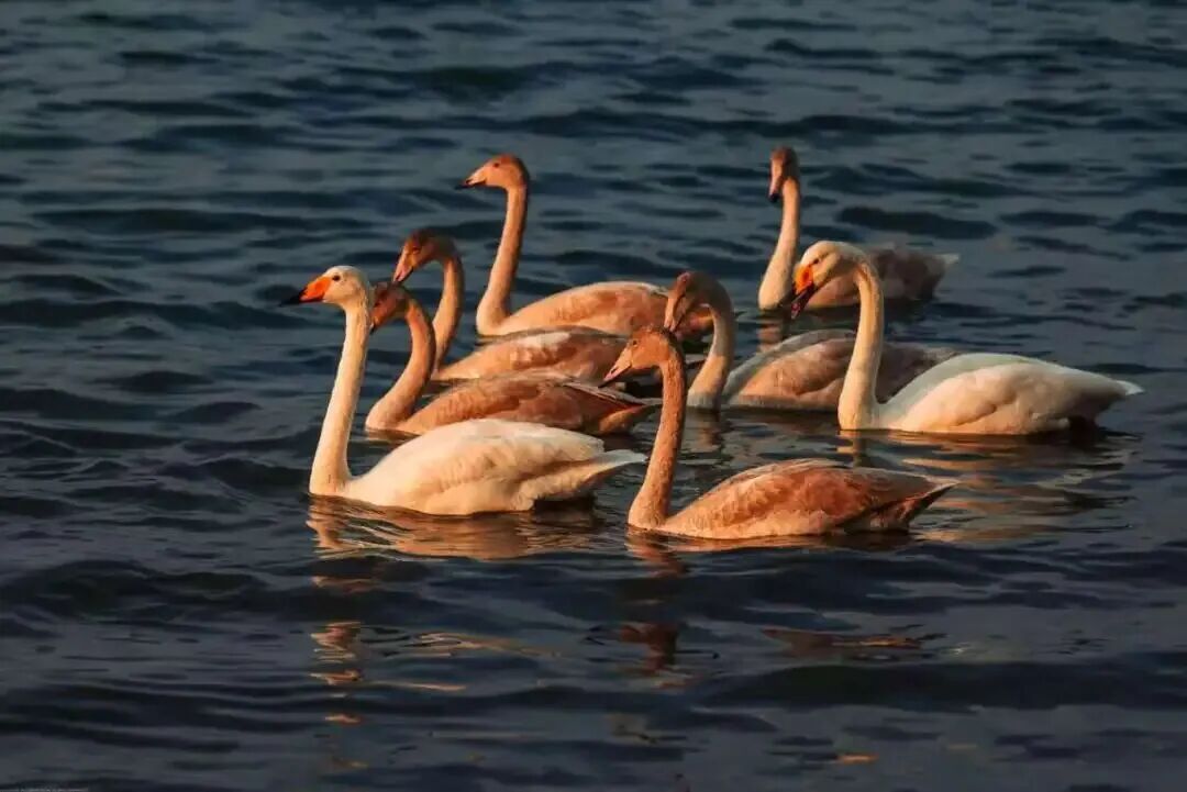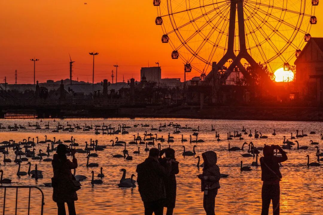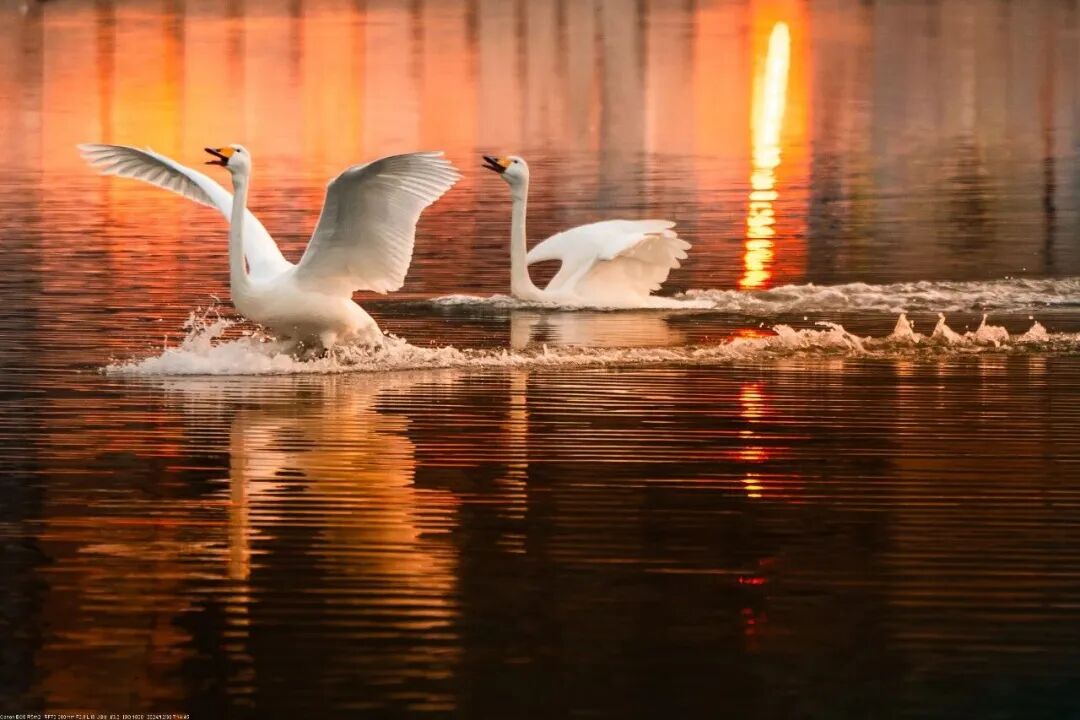 绝美的创意构图:以远处的群山、森林或那香海小镇建筑为背景,将天鹅作为画面的灵动主角。尤其在日出日落时分,金色的光线为白色的天鹅群披上霞光,成就一幅无可复制的自然画卷。
