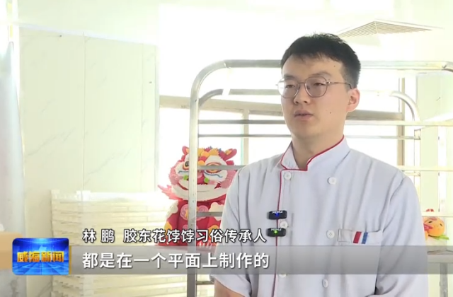 胶东花饽饽习俗传承人林鹏说,平时做生肖类的,包括龙花饽饽都是在一个平面上制作的,很少有去做立体的。从这个龙的骨架造型上的设计、龙头部分的制作,它是比较有难度的,他也是研究了能有半个月。