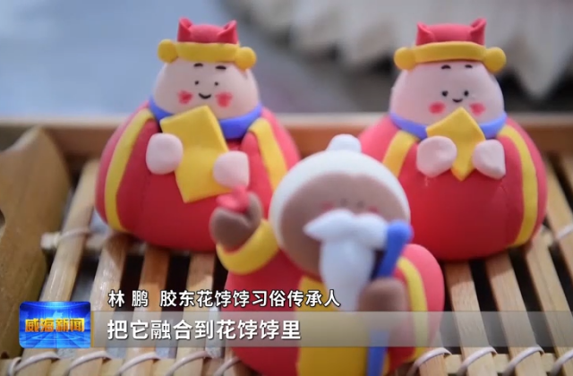 在威海如众食品有限公司的面点加工坊里,胶东花饽饽习俗传承人林鹏正专注揉捏面团。他的作品《龙腾盛世》不久前斩获了2025年山东省非遗文创设计大赛入围奖,将文登“李龙王故乡”文化与面塑技艺相融。